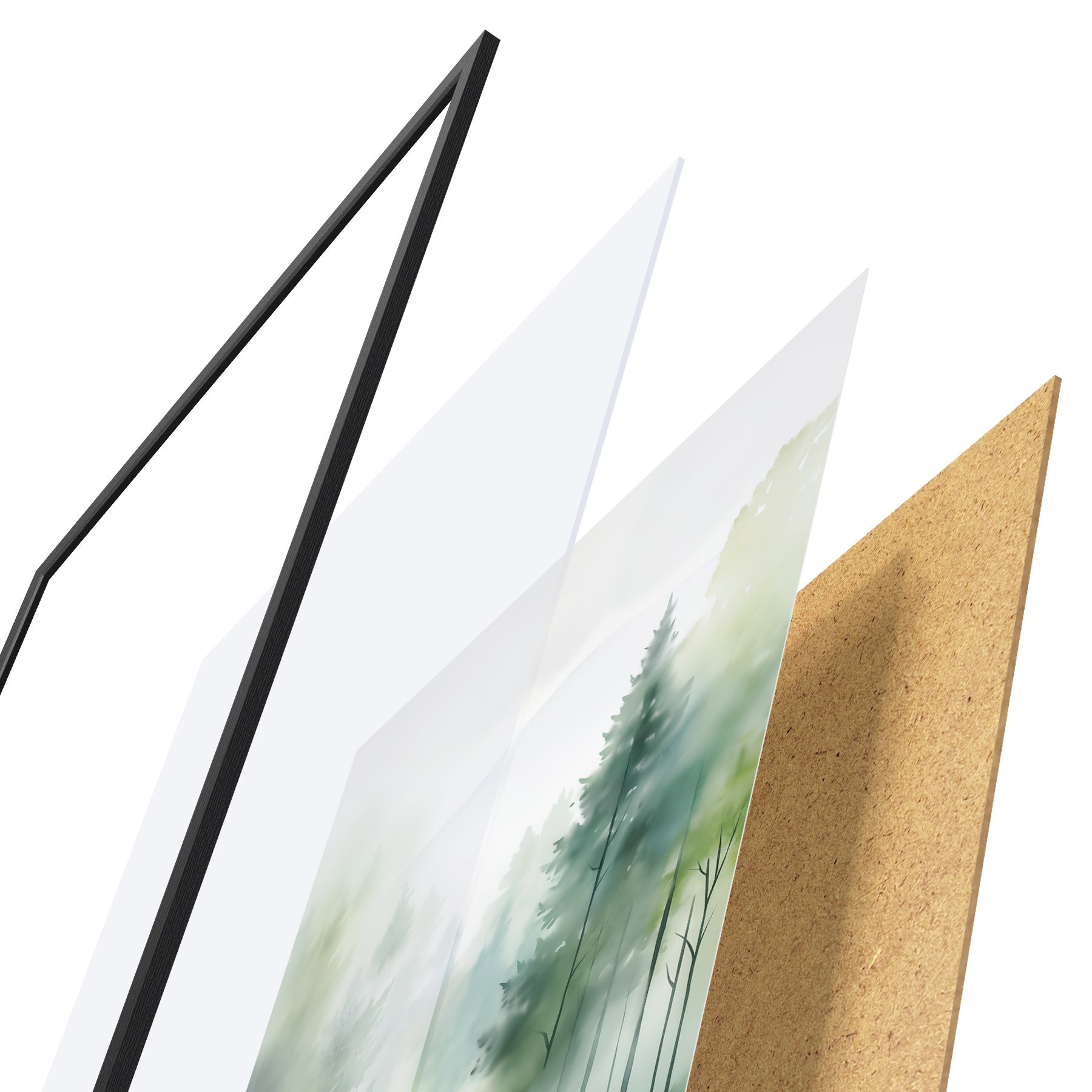 L’affiche encadrée est composée d’un cadre, d’un plexiglas, d’une image imprimée et d’un support en aggloméré. Elle est prête à être accrochée au mur grâce aux fixations situées à l’arrière.