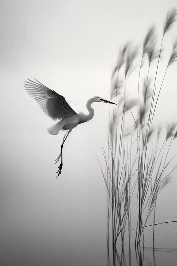 Poster Un héron blanc aux ailes déployées, volant près de grands roseaux, composition minimaliste en noir et blanc Nr f46693