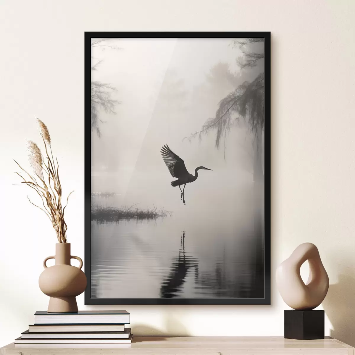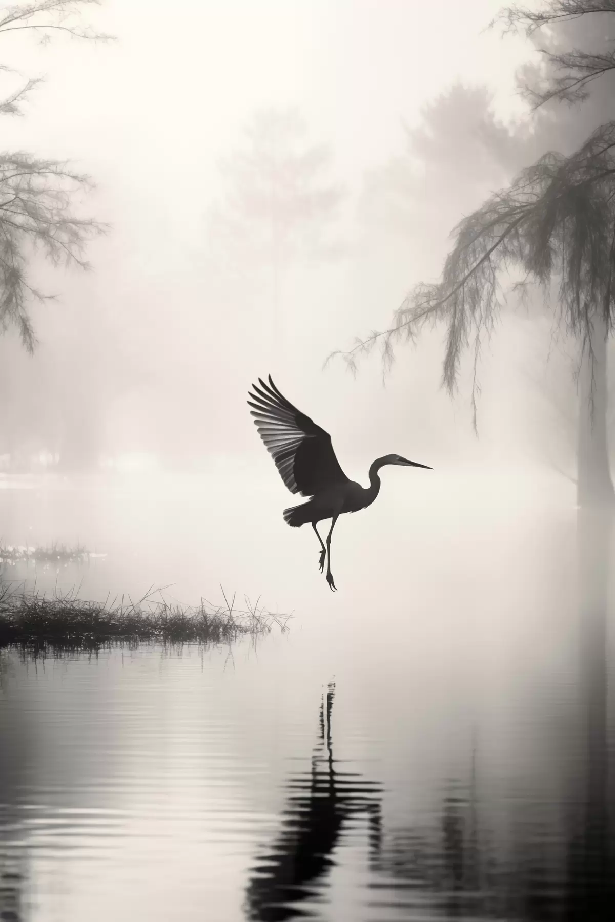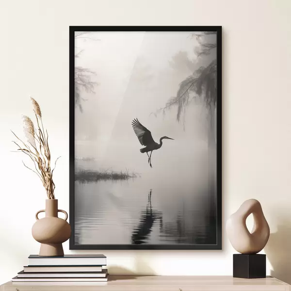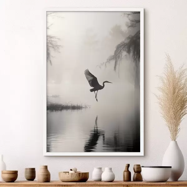 Poster Un héron blanc aux ailes déployées, volant près de grands roseaux, composition minimaliste en noir et blanc Nr f46694