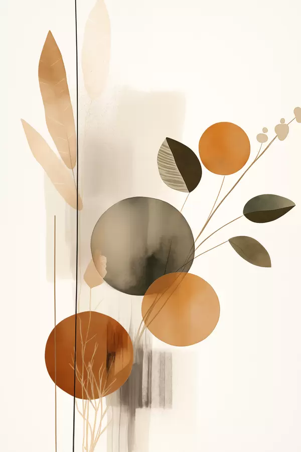 Poster Imitation de peinture abstraite avec des cercles orange et gris, des feuilles et des branches, style moderne, effet aquarelle Nr f46697