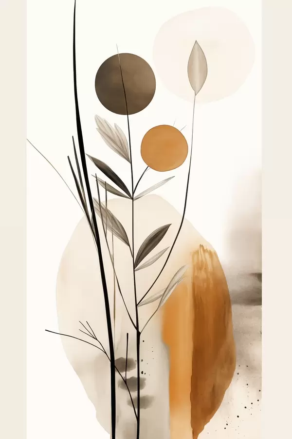 Poster Imitation de peinture abstraite avec des cercles orange et gris, des feuilles et des branches, style moderne, effet aquarelle Nr f46698