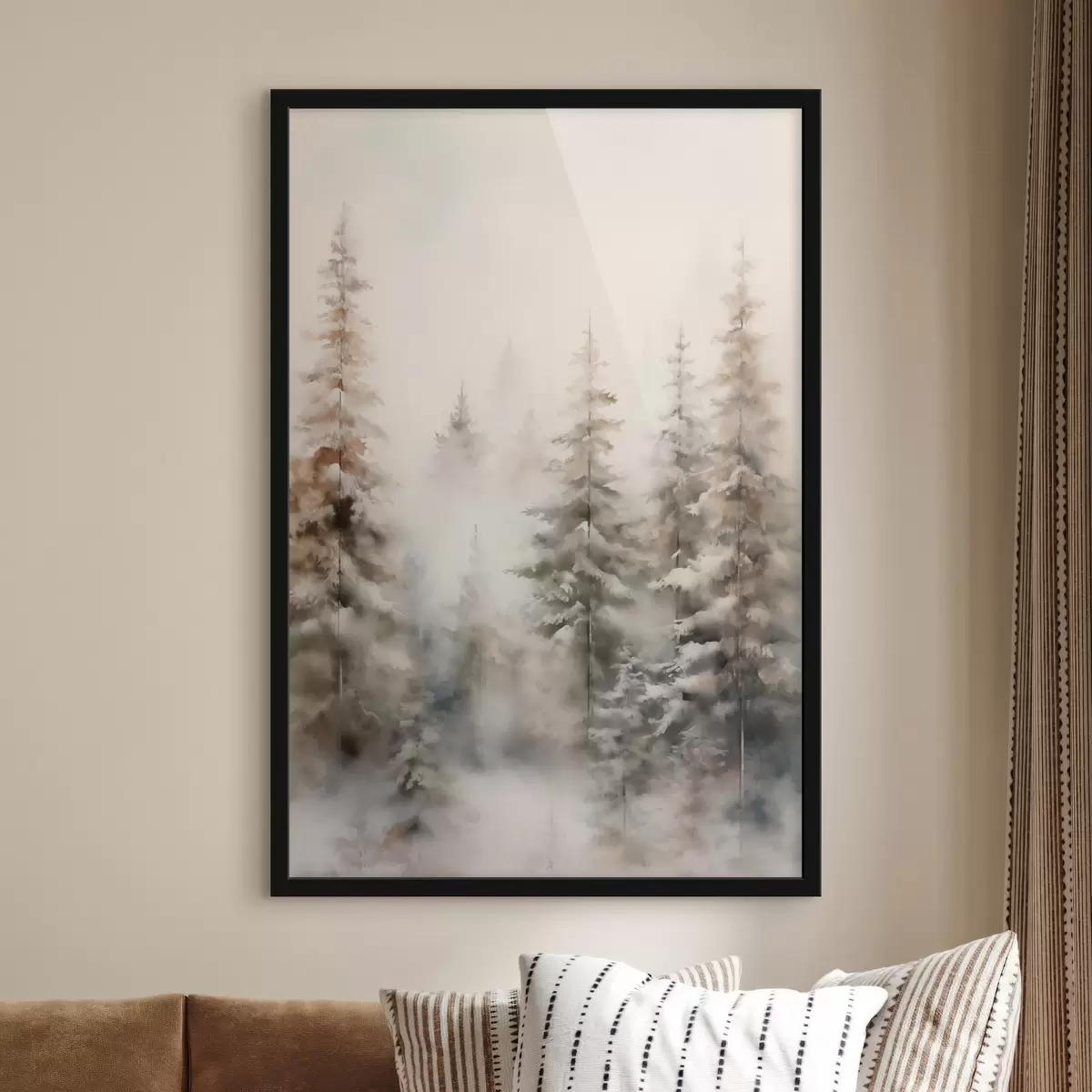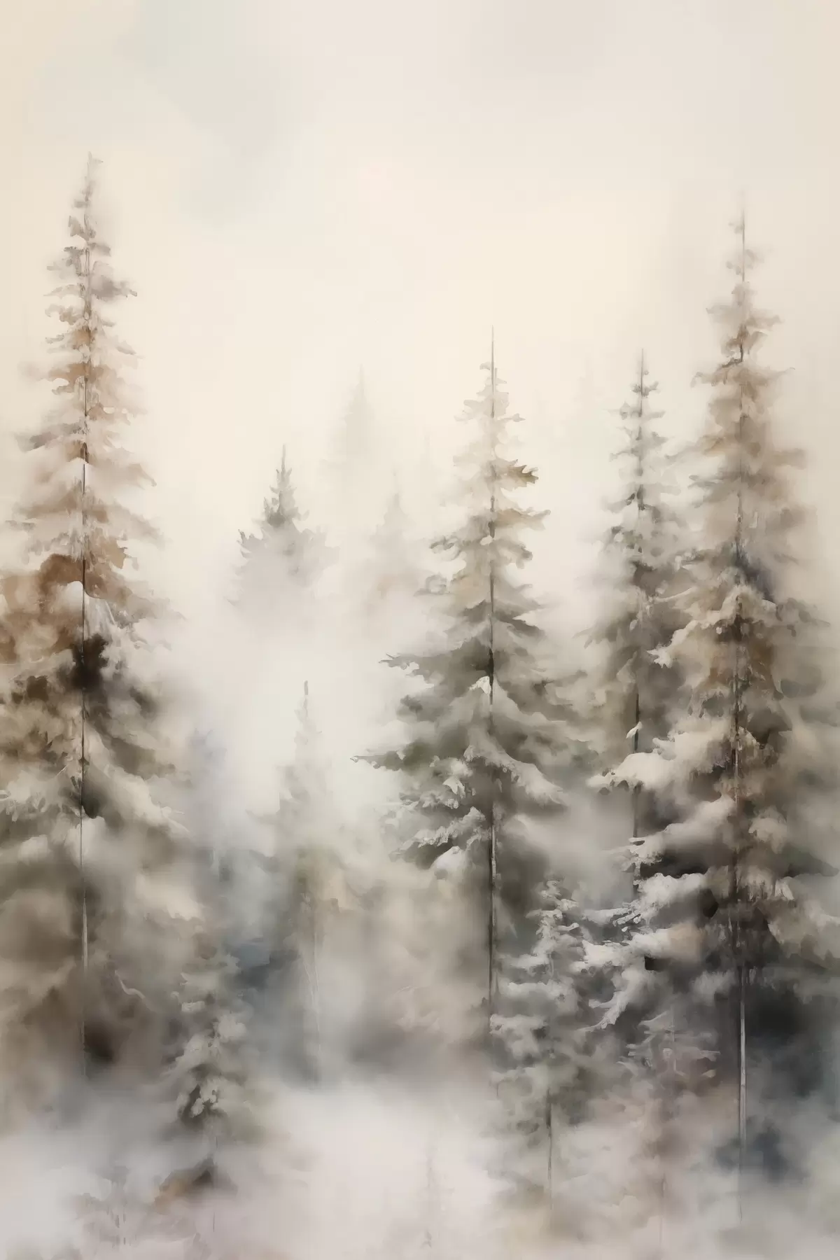 Poster De grands pins recouverts de neige, dressés dans une forêt brumeuse, une scène hivernale douce et feutrée. f46701