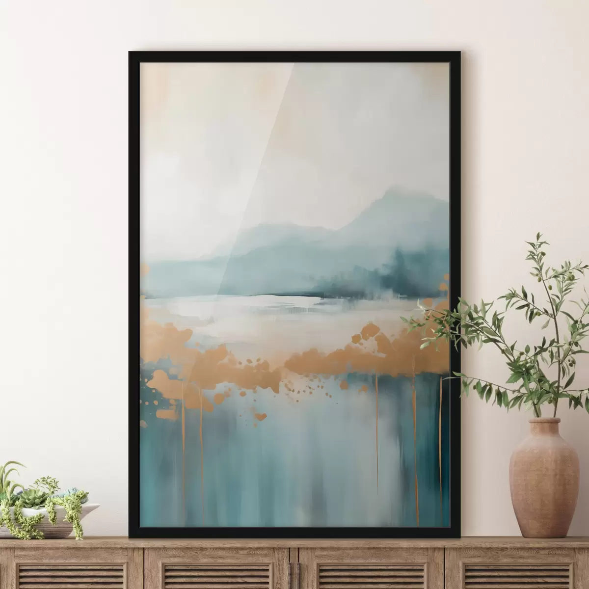 Poster Paysage abstrait avec montagnes et lac dans des tons bleu sarcelle et jaune texturé, coups de pinceau doux, œuvre minimaliste Nr f46703