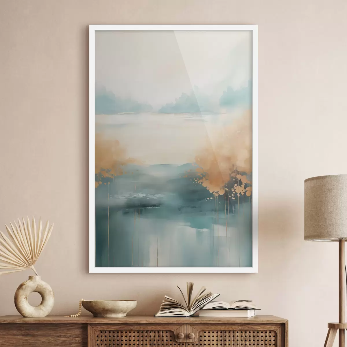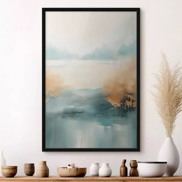 Poster Paysage abstrait avec montagnes et lac dans des tons bleu sarcelle et jaune texturé, coups de pinceau doux, œuvre minimaliste Nr f46704