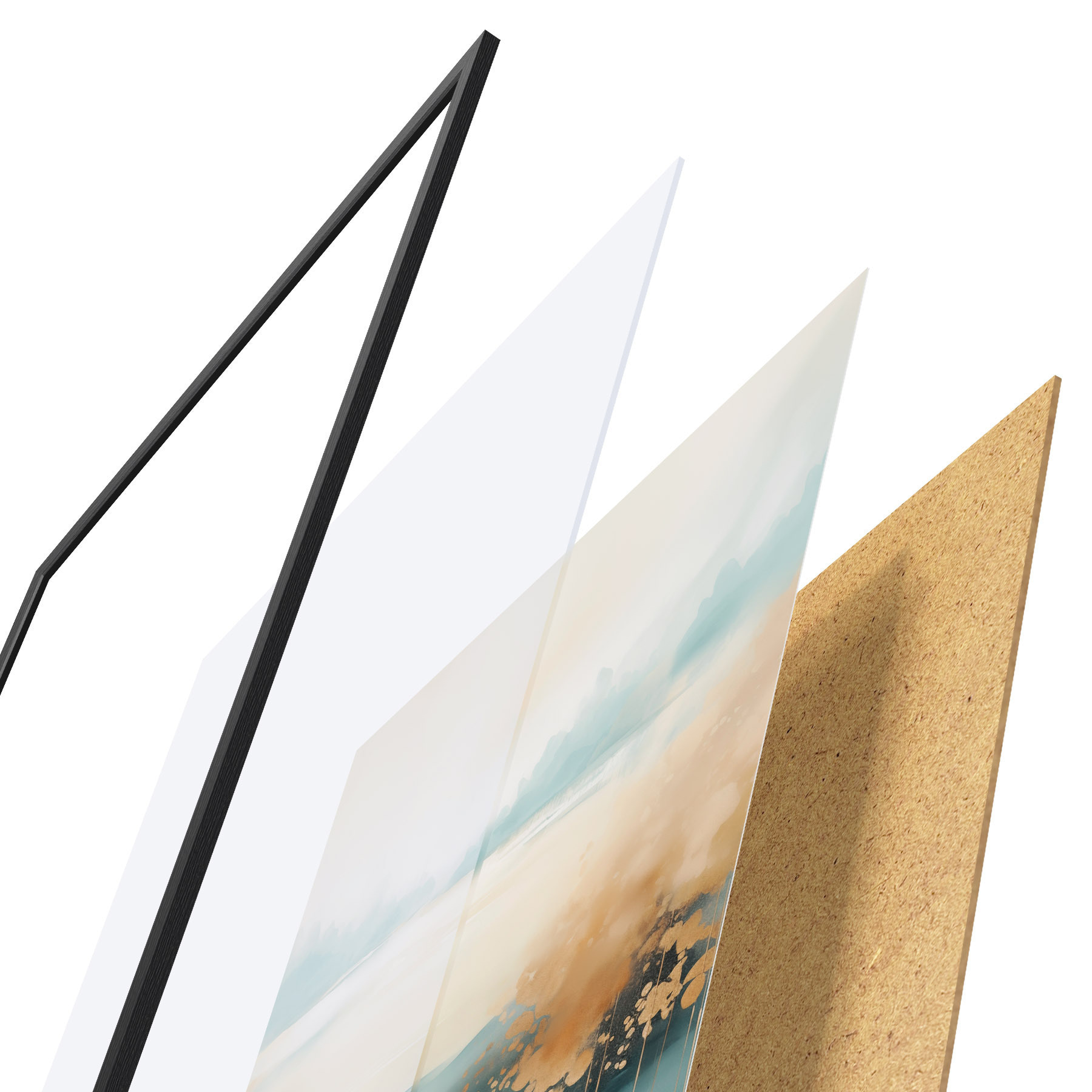 L’affiche encadrée est composée d’un cadre, d’un plexiglas, d’une image imprimée et d’un support en aggloméré. Elle est prête à être accrochée au mur grâce aux fixations situées à l’arrière.
