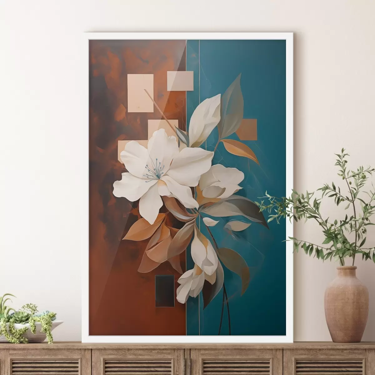 Poster Fleurs et feuilles blanches abstraites sur fond brun et bleu avec des formes abstraites, dans un style minimaliste. f46709