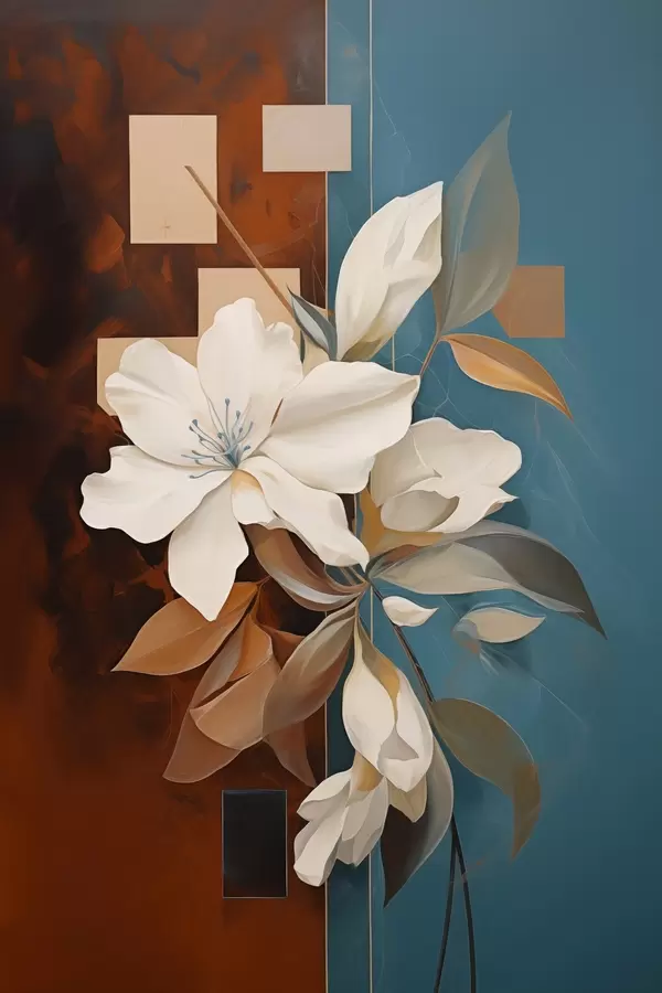 Poster Fleurs et feuilles blanches abstraites sur fond brun et bleu avec des formes abstraites, dans un style minimaliste. f46709