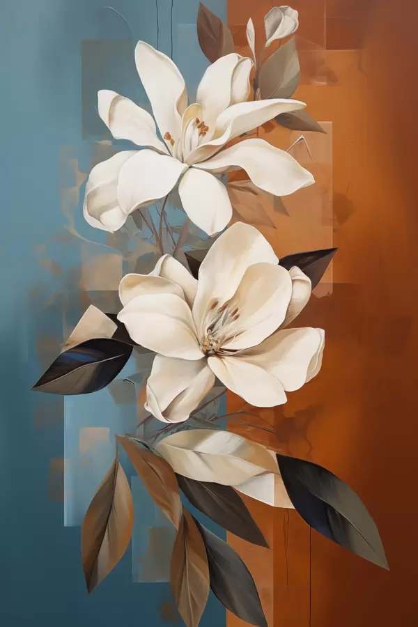 Poster Fleurs et feuilles blanches abstraites sur fond brun et bleu avec des formes abstraites, dans un style minimaliste Nr f46710