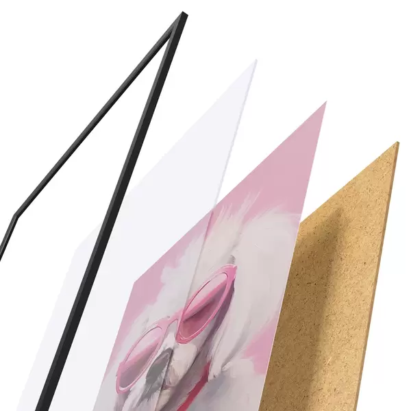 L’affiche encadrée est composée d’un cadre, d’un plexiglas, d’une image imprimée et d’un support en aggloméré. Elle est prête à être accrochée au mur grâce aux fixations situées à l’arrière.