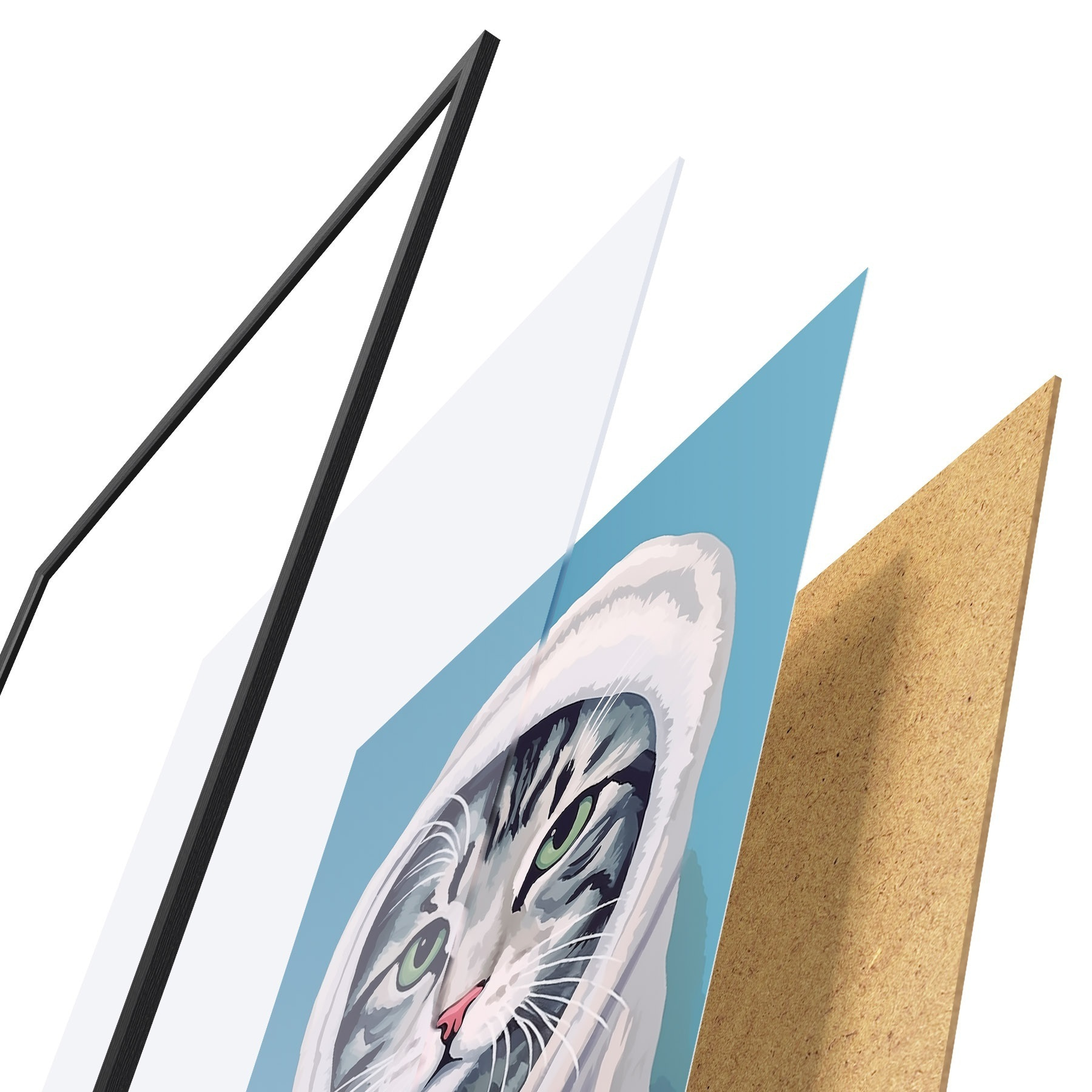 L’affiche encadrée est composée d’un cadre, d’un plexiglas, d’une image imprimée et d’un support en aggloméré. Elle est prête à être accrochée au mur grâce aux fixations situées à l’arrière.