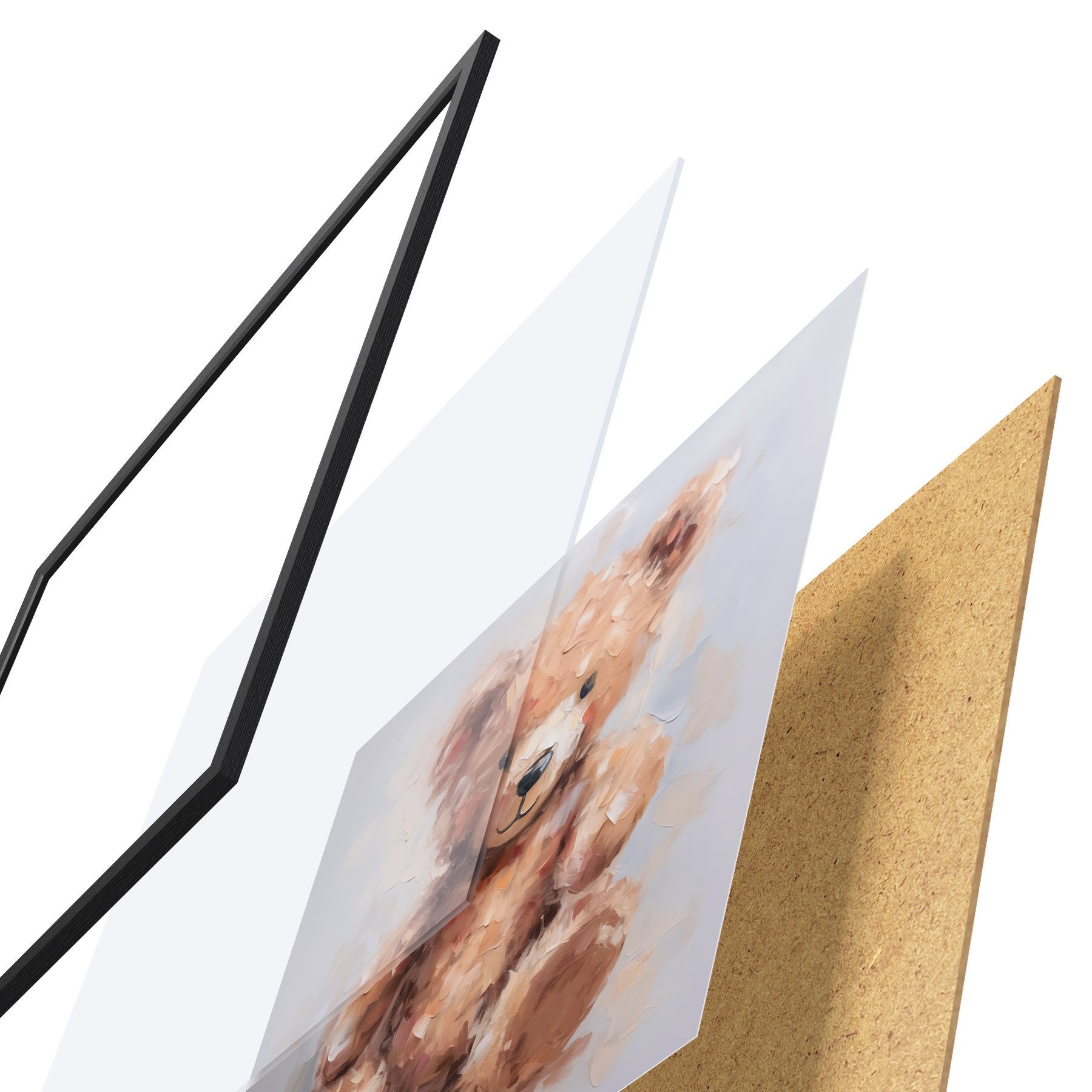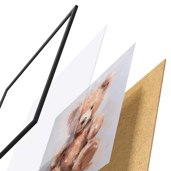 L’affiche encadrée est composée d’un cadre, d’un plexiglas, d’une image imprimée et d’un support en aggloméré. Elle est prête à être accrochée au mur grâce aux fixations situées à l’arrière.