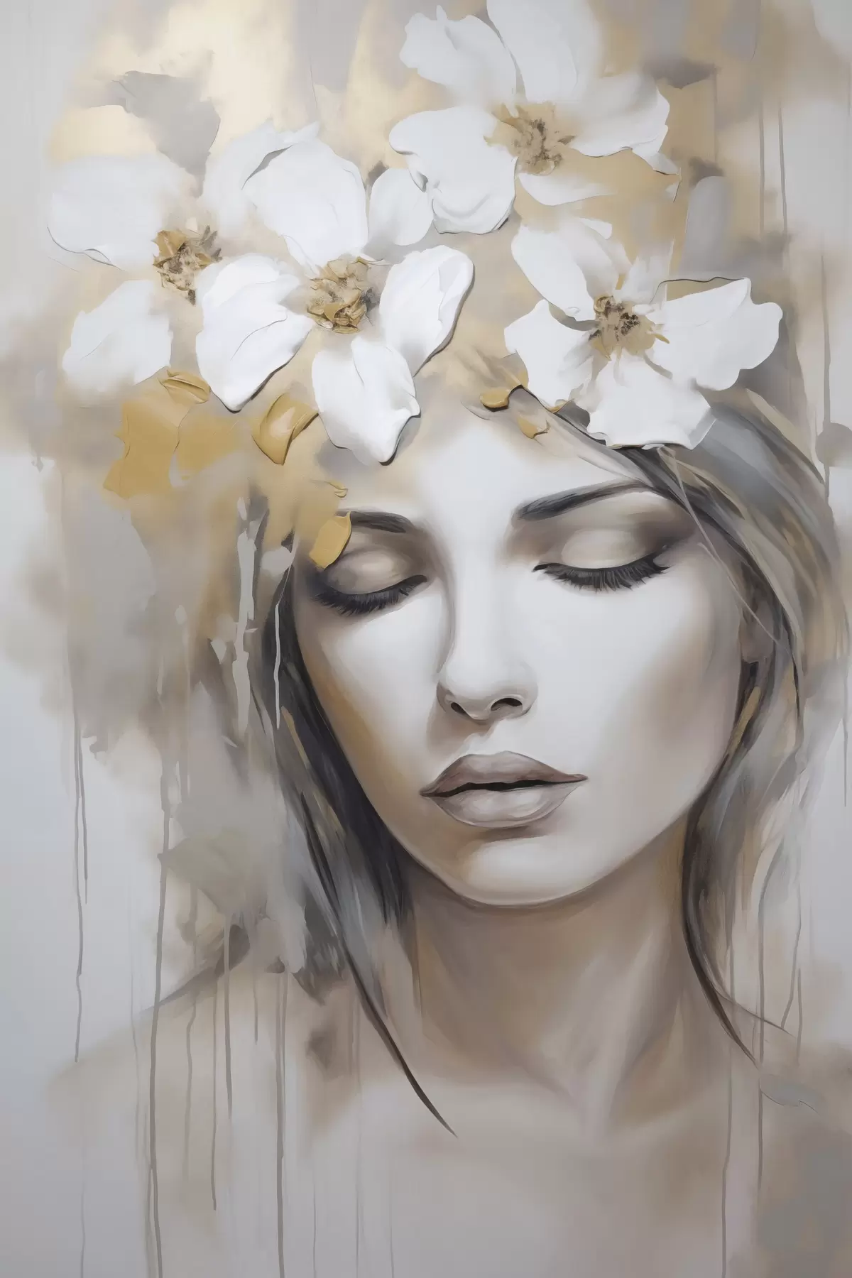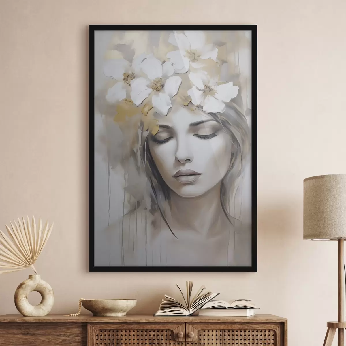 Poster Portrait abstrait d'une jeune fille avec des fleurs, imitation d'une peinture Nr f46756