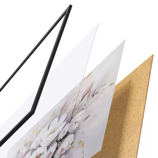 L’affiche encadrée est composée d’un cadre, d’un plexiglas, d’une image imprimée et d’un support en aggloméré. Elle est prête à être accrochée au mur grâce aux fixations situées à l’arrière.