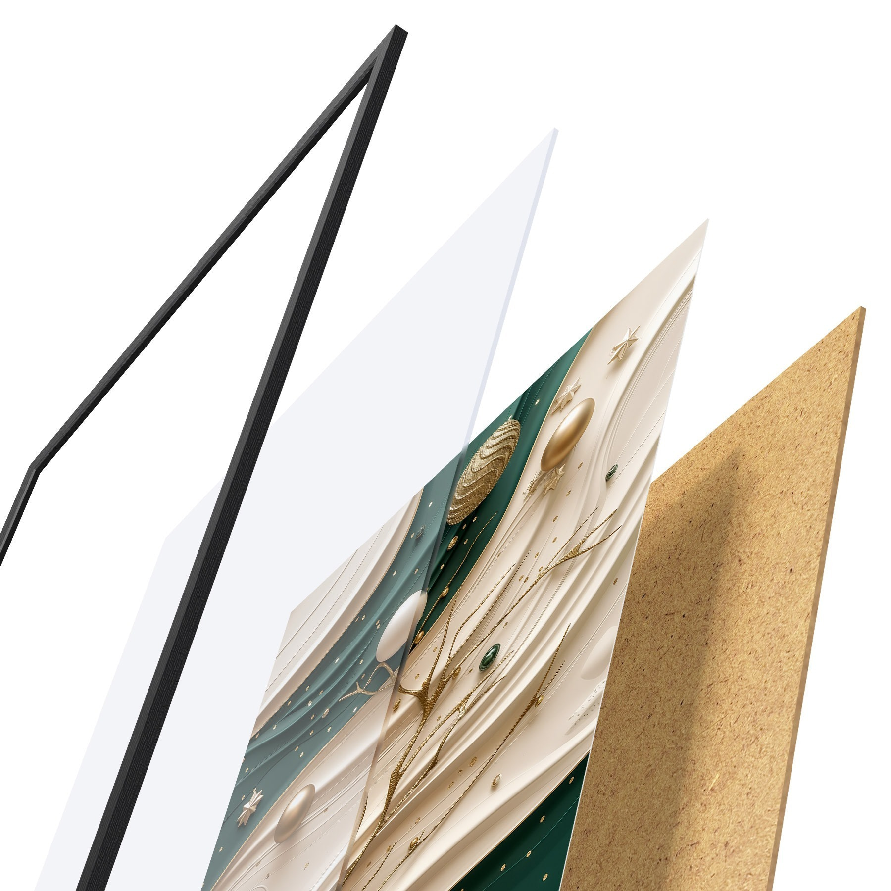 L’affiche encadrée est composée d’un cadre, d’un plexiglas, d’une image imprimée et d’un support en aggloméré. Elle est prête à être accrochée au mur grâce aux fixations situées à l’arrière.
