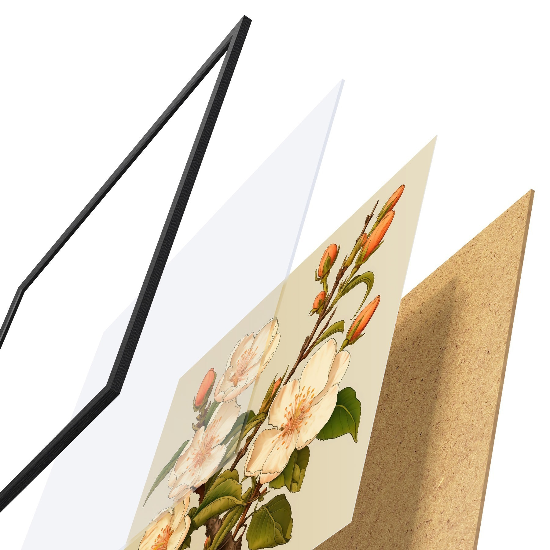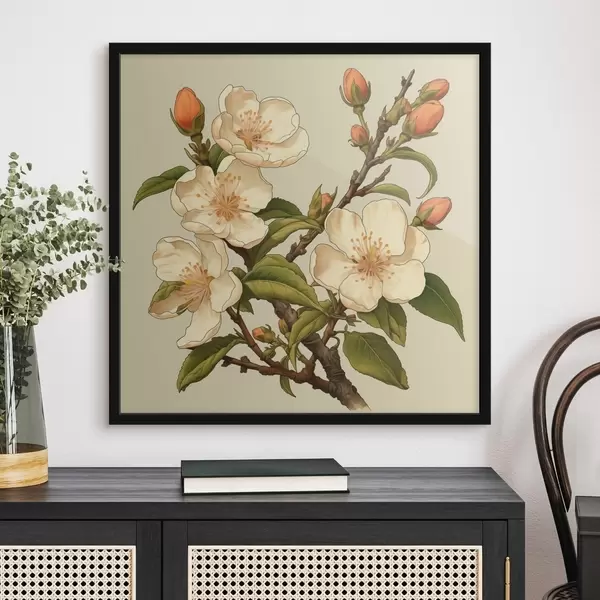Poster Branche fleurie avec des fleurs blanches sur fond beige dans le style d'une illustration classique Nr f46923
