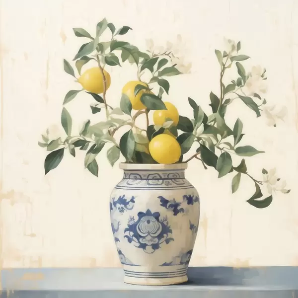 Poster Citrons dans un vase en céramique bleu et blanc dans le style d'une peinture à l'huile Nr f46924
