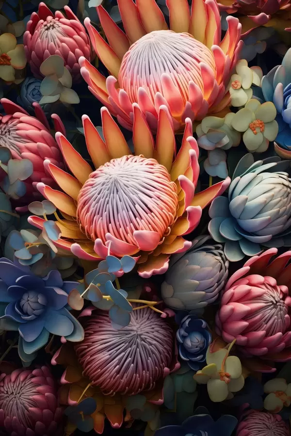 Poster Composition de protéas, d'eucalyptus et de plantes succulentes dans un style artistique numérique photoréaliste Nr f46925