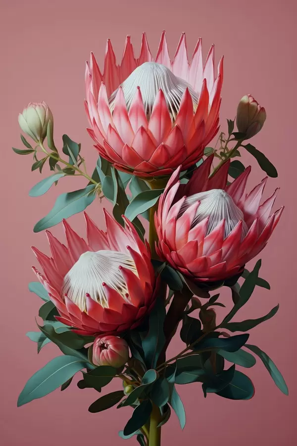 Poster Bouquet de protéas aux pétales rouges et feuillage vert sur fond rose Nr f46946