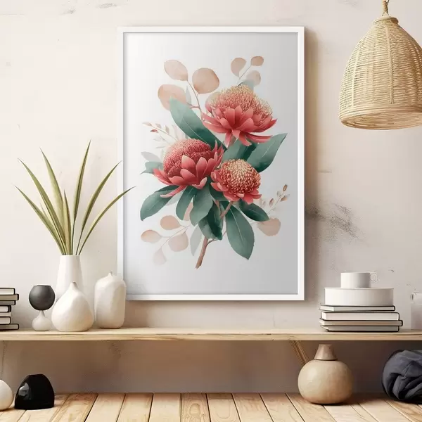 Poster Bouquet expressif composé de protéas et de feuillages décoratifs dans un style illustratif moderne. Nr f46954