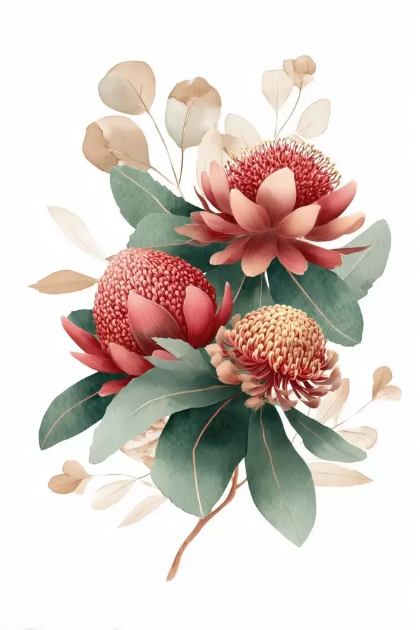 Poster Composition florale avec de grandes protéas et de l'eucalyptus dans un style moderne d'illustration numérique. Nr f46955