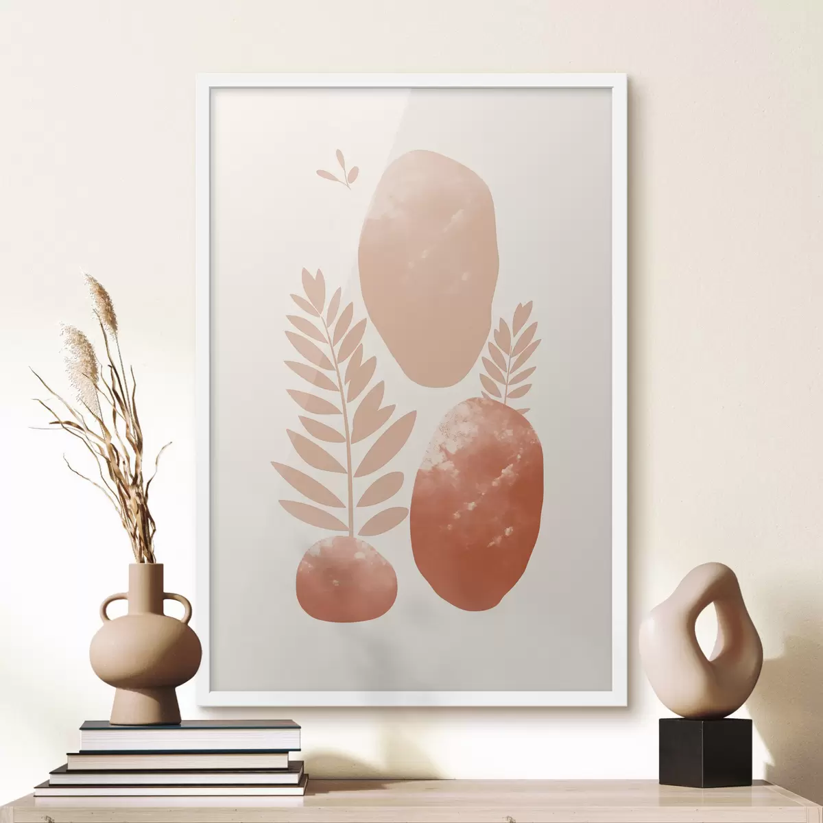 Poster Formes abstraites, pierres texturées et feuilles dans des tons pêche et terre cuite discrets, minimalistes, fond crème. f47012