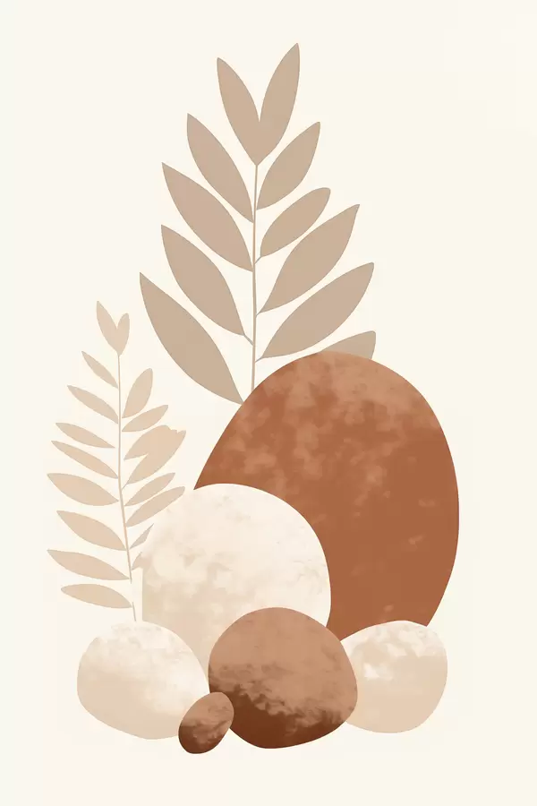 Poster Formes abstraites, pierres texturées et feuilles dans des tons pêche et terre cuite discrets, minimalistes, fond crème Nr f47013
