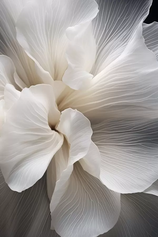 Poster Gros plan sur de délicats pétales de fleurs blancs abstraits aux lignes complexes et au fond sombre flou Nr f47018