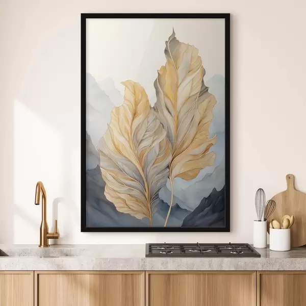 Poster Feuilles abstraites, grandes, jaunes et brunes, aux détails complexes, sur fond de paysage montagneux. Nr f47023