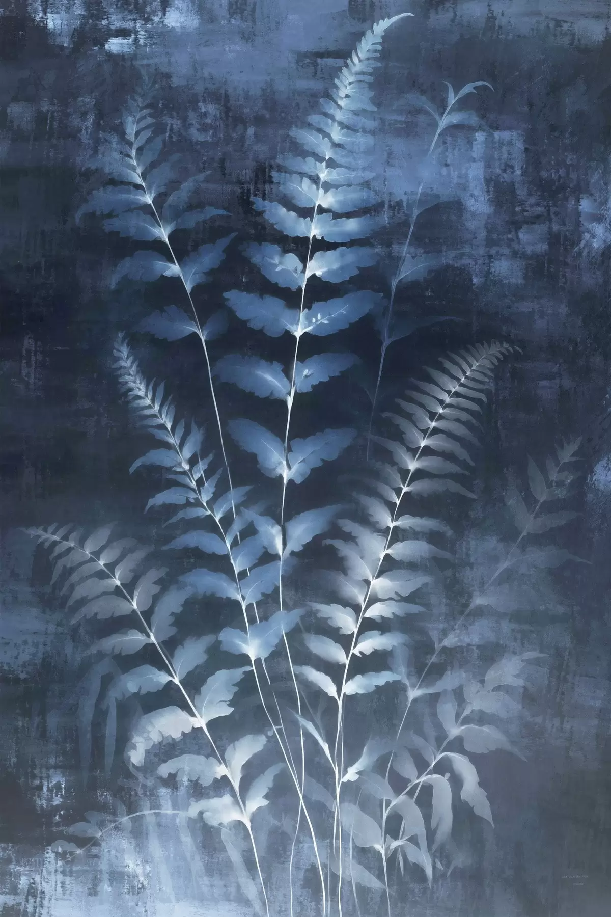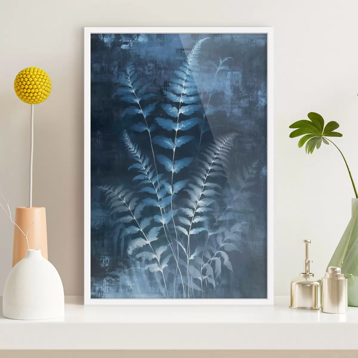 Poster Fougères bleues et plantes sur un fond sombre et texturé, avec un accent sur les détails complexes, effet rayons X. Nr f47027