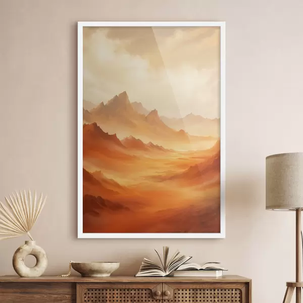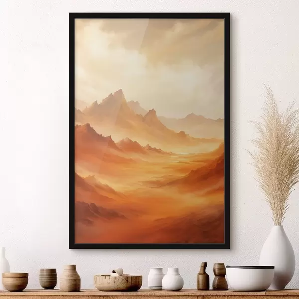 Poster Un vaste paysage désertique orange avec des montagnes rocheuses imposantes sous un ciel brumeux et ensoleillé, parsemé de nuages vaporeux. Nr f47029