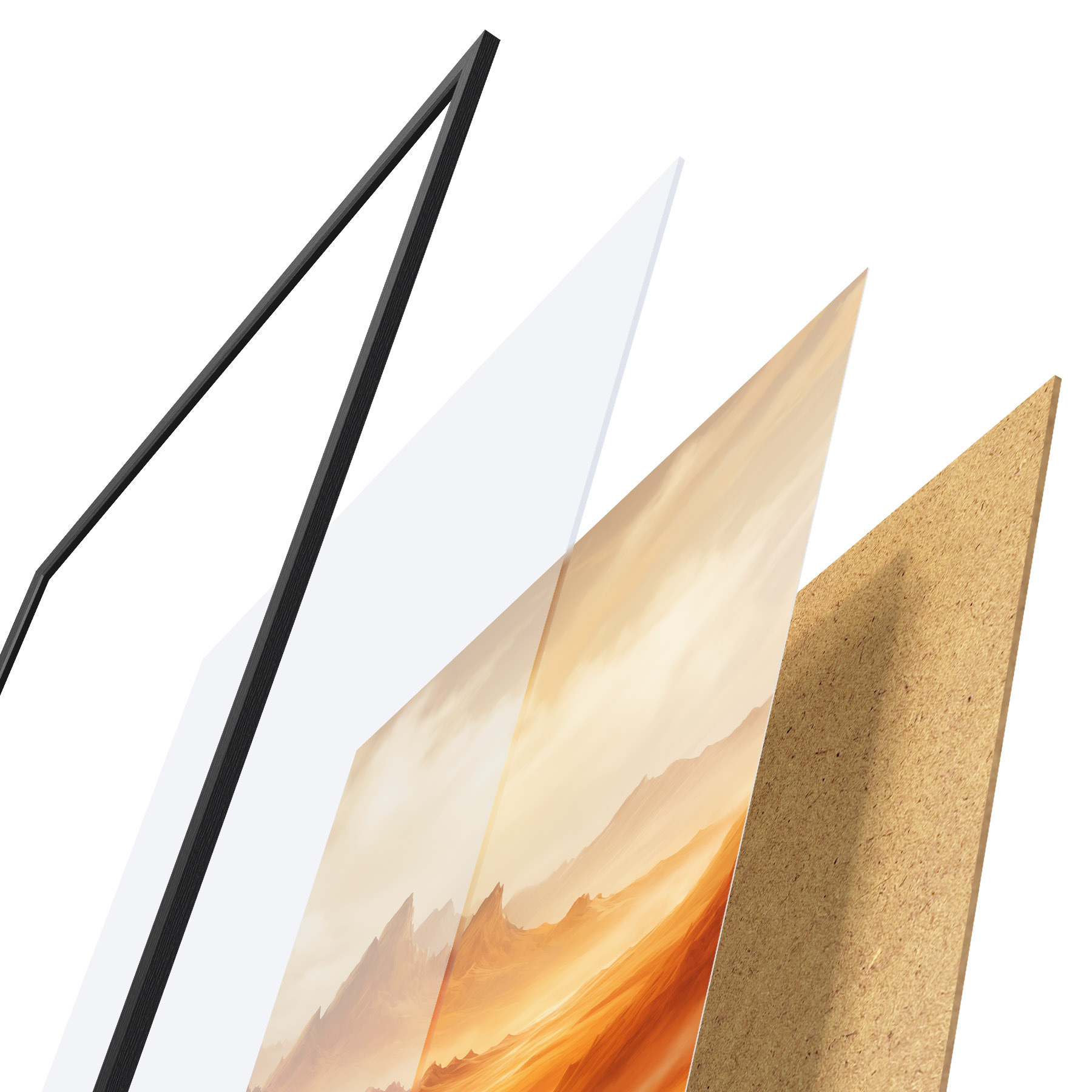 L’affiche encadrée est composée d’un cadre, d’un plexiglas, d’une image imprimée et d’un support en aggloméré. Elle est prête à être accrochée au mur grâce aux fixations situées à l’arrière.
