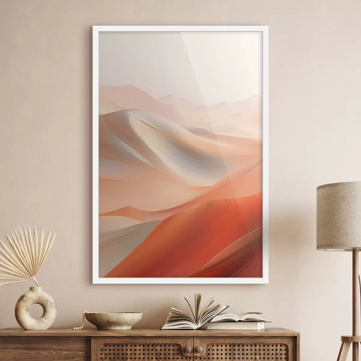 Poster Paysage désertique abstrait avec des dunes de sable ondulantes dans des tons chauds orange et blanc Nr f47030