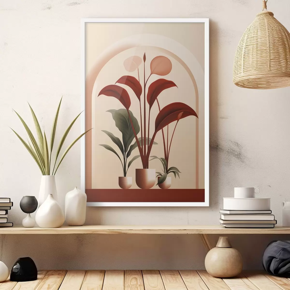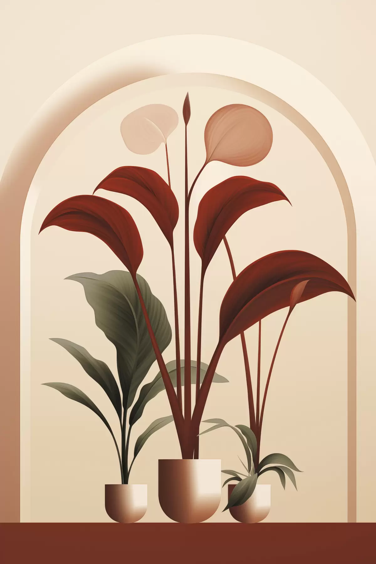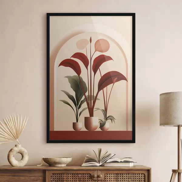 Poster Plantes en pot abstraites avec de grandes feuilles vertes et rouges devant une arche de couleur crème. f47033