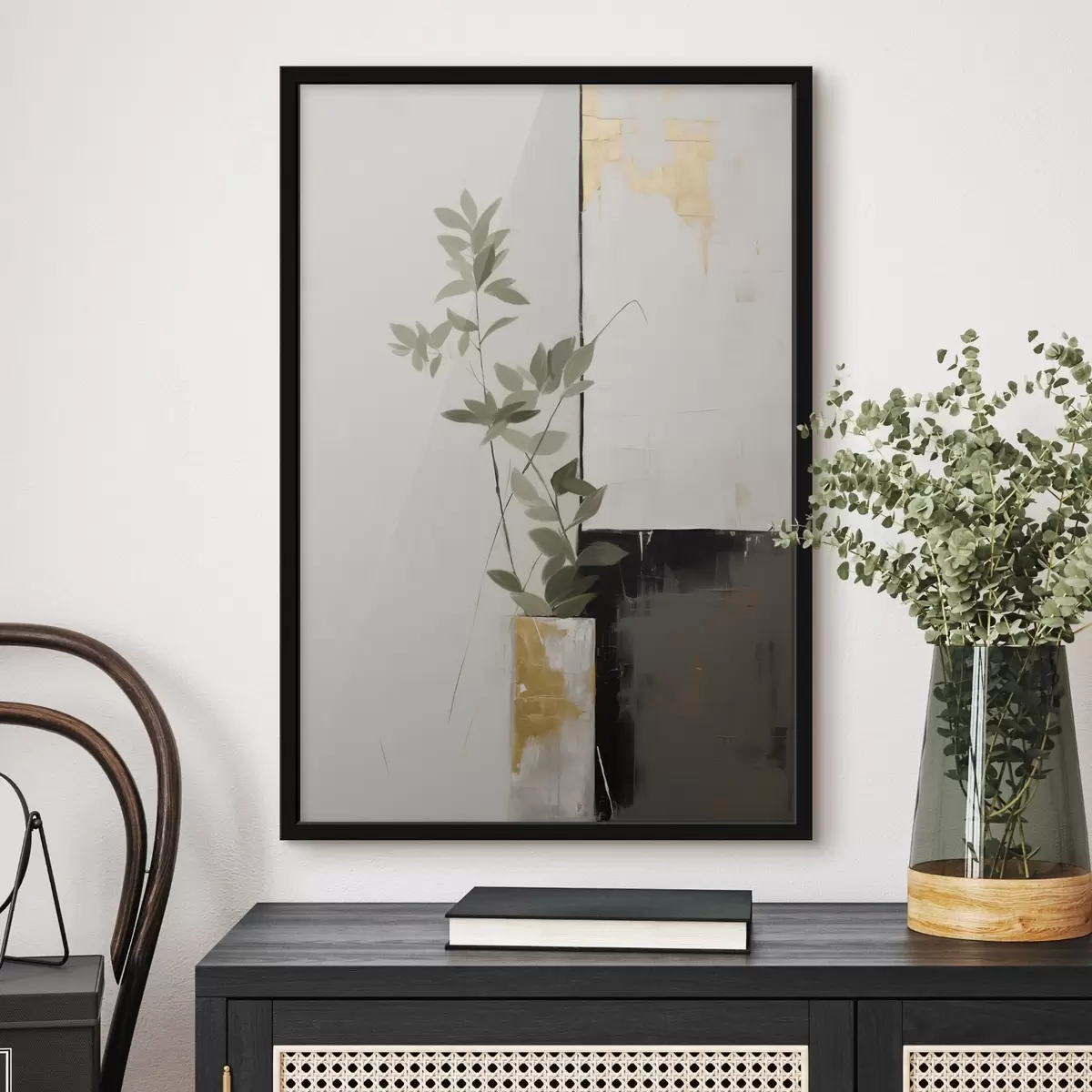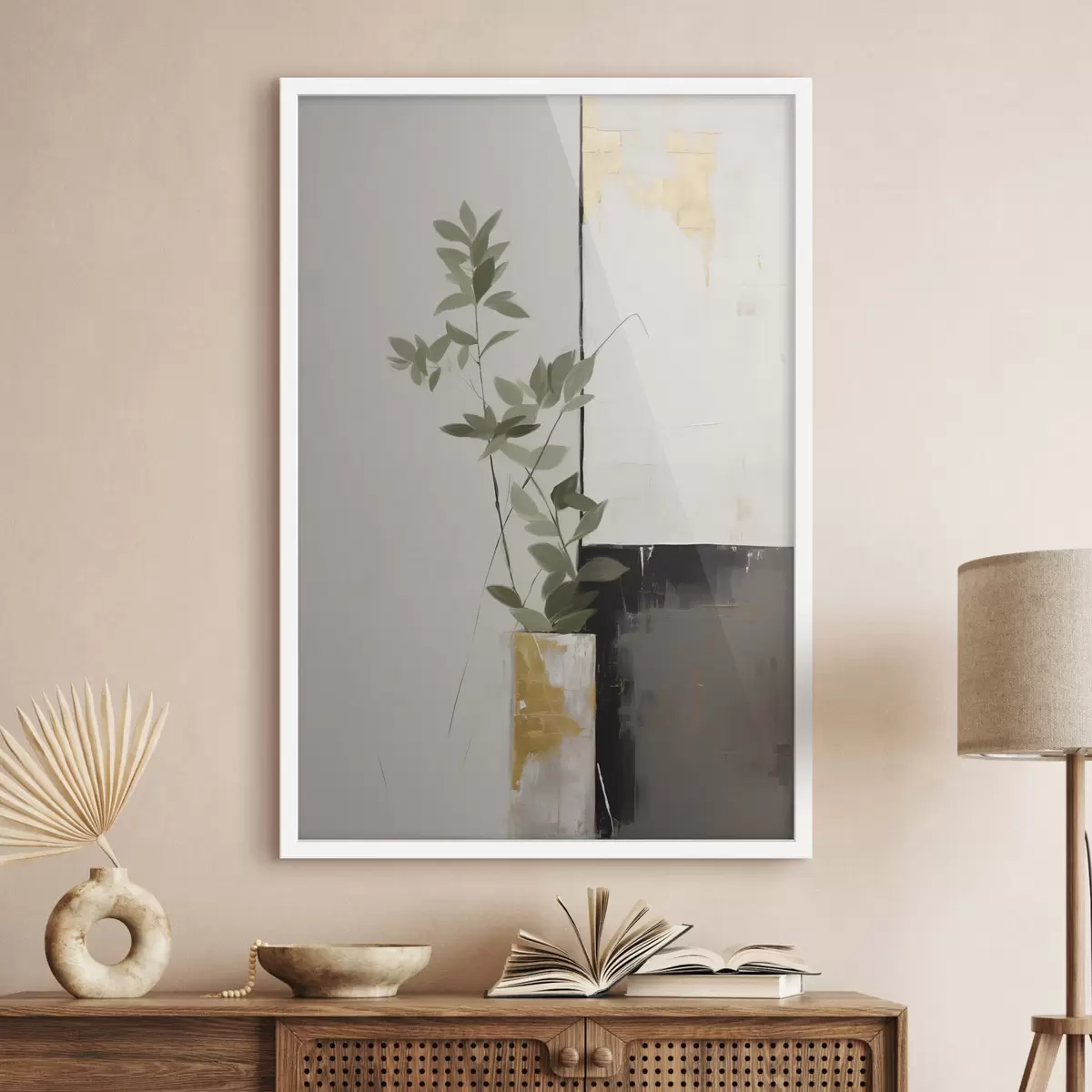 Poster Une peinture minimaliste texturée représentant un vase avec des feuilles vertes sur fond de formes géométriques abstraites. Nr f47036