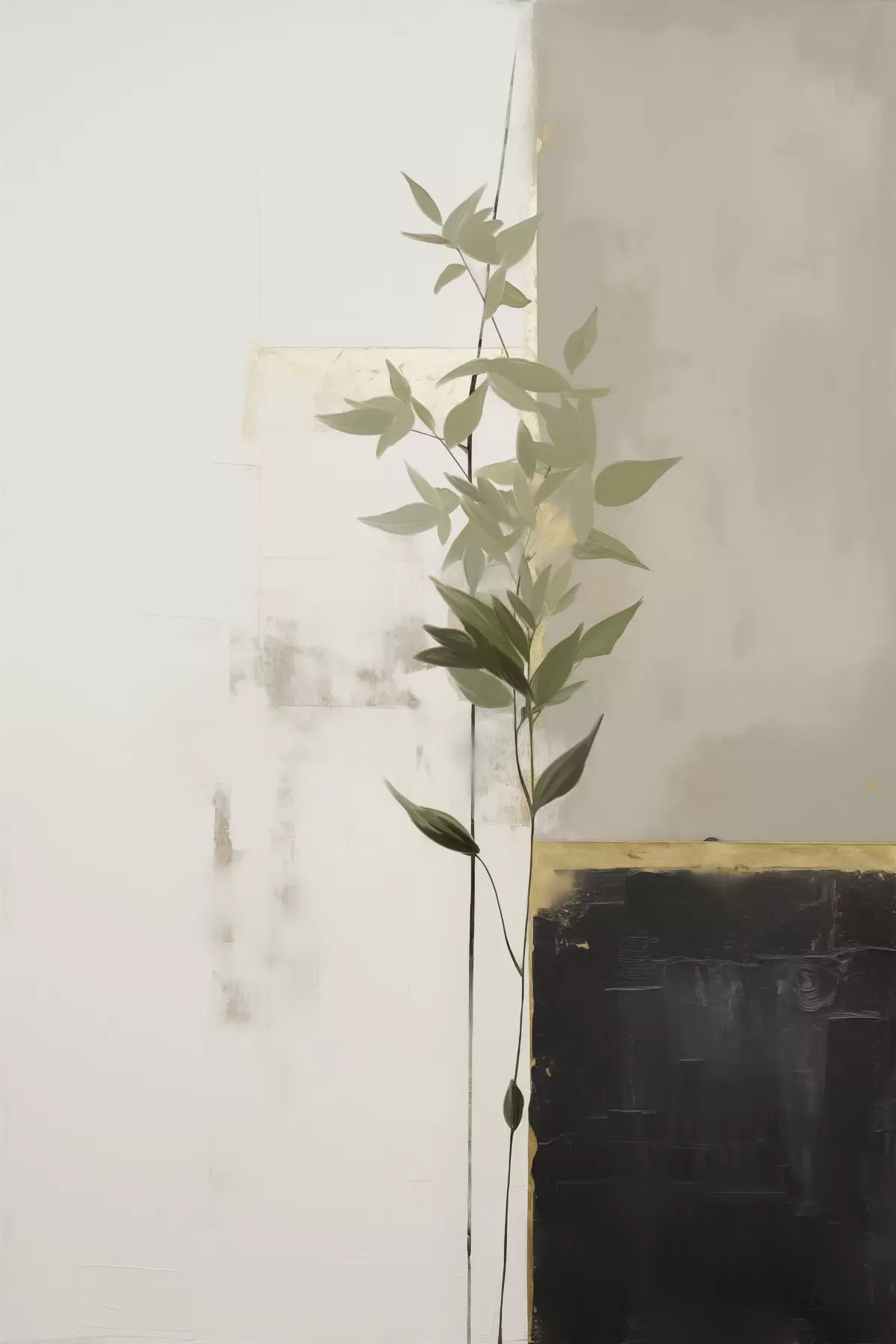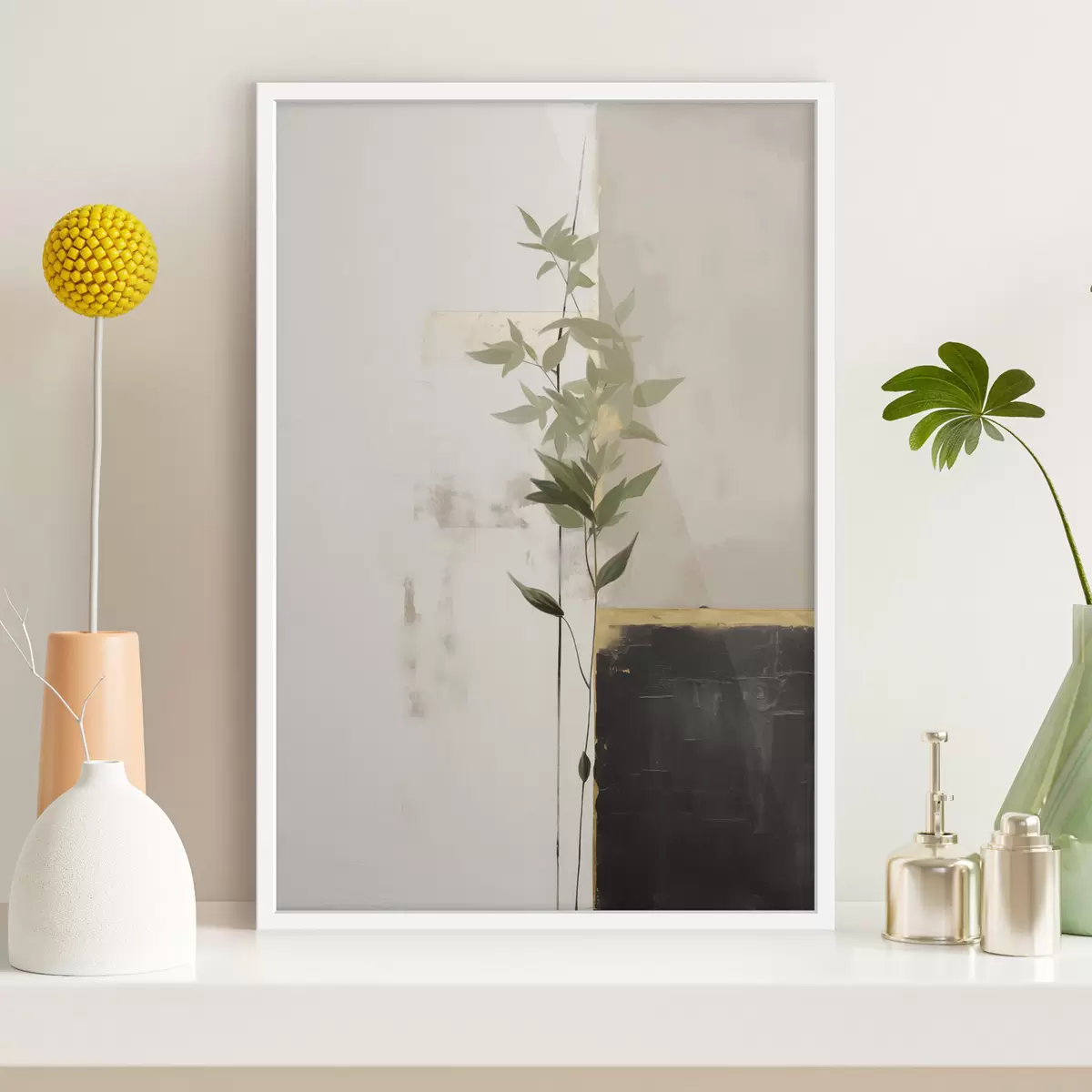 Poster Une peinture minimaliste texturée représentant un vase avec des feuilles vertes sur fond de formes géométriques abstraites. Nr f47037