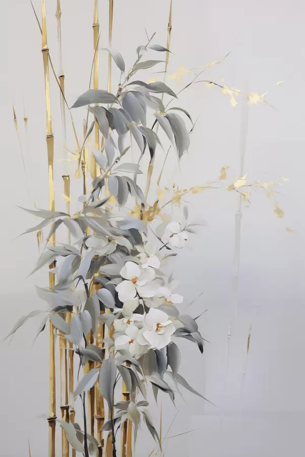 Poster Tiges de bambou abstraites avec des accents jaunes, des fleurs blanches délicates et des feuilles vert pâle, fond gris Nr f47038