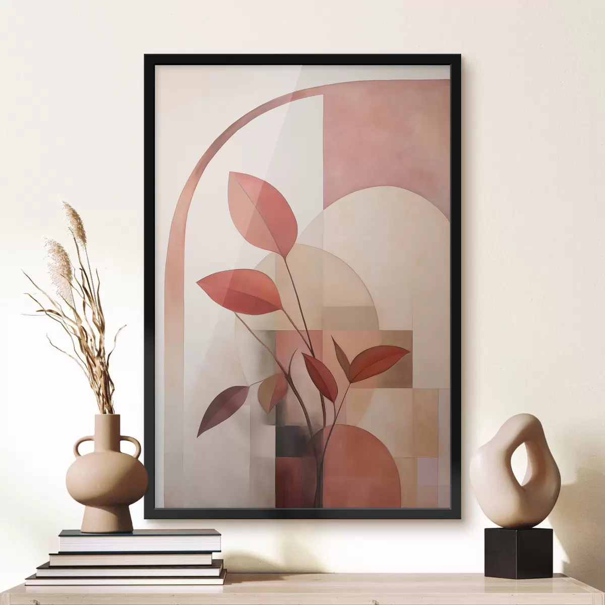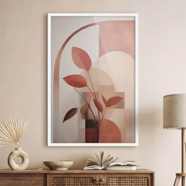 Poster Plante abstraite aux feuilles rouges sur fond de formes géométriques et de couleurs douces et discrètes Nr f47040