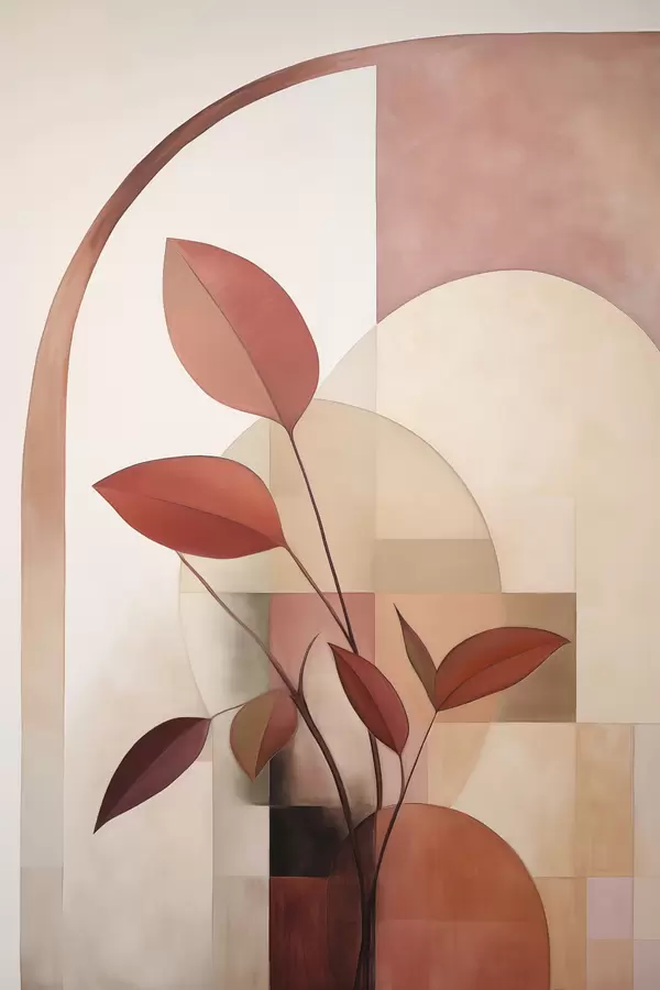 Poster Plante abstraite aux feuilles rouges sur fond de formes géométriques et de couleurs douces et discrètes Nr f47040