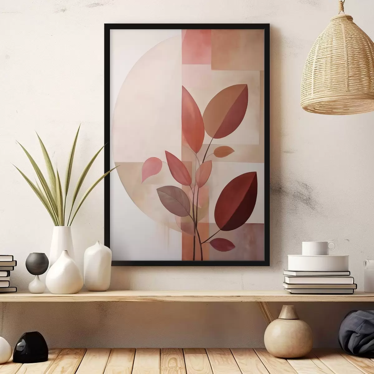 Poster Plante abstraite aux feuilles rouges sur fond de formes géométriques et de couleurs douces et discrètes Nr f47041