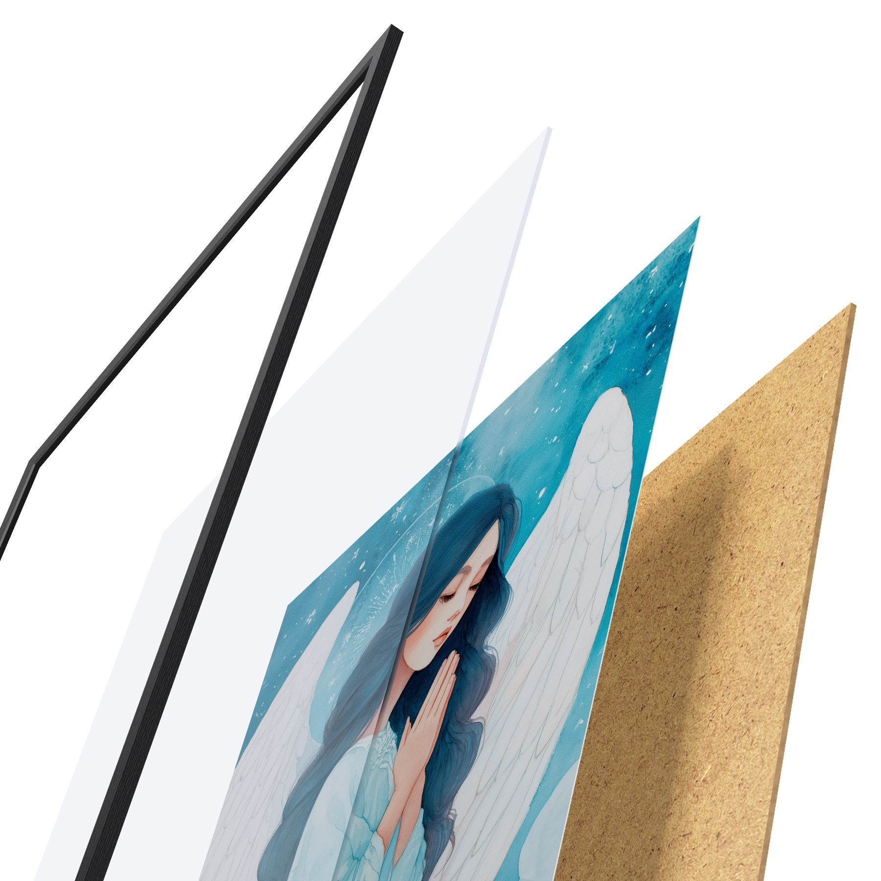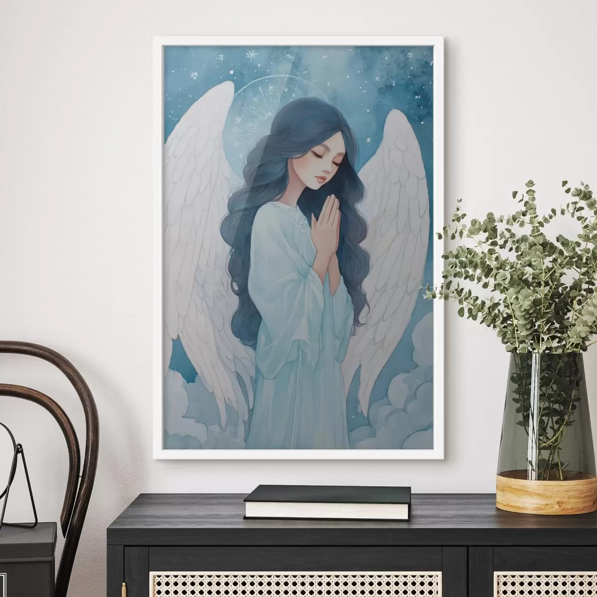 Poster Charmante illustration d'un ange parmi les nuages dans une palette de couleurs blanches et bleues. Nr f47095