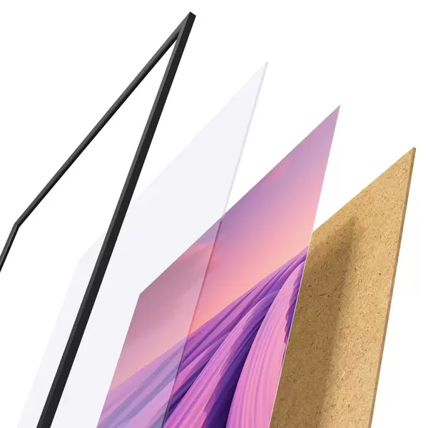 L’affiche encadrée est composée d’un cadre, d’un plexiglas, d’une image imprimée et d’un support en aggloméré. Elle est prête à être accrochée au mur grâce aux fixations situées à l’arrière.