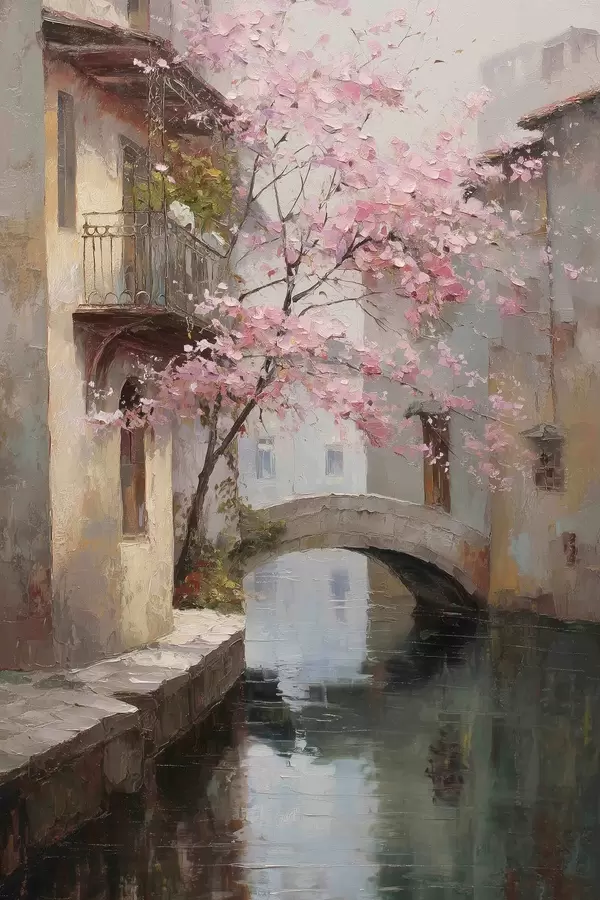 Poster paysage urbain romantique avec un arbre en fleurs dans le style d'une peinture à l'huile f47126
