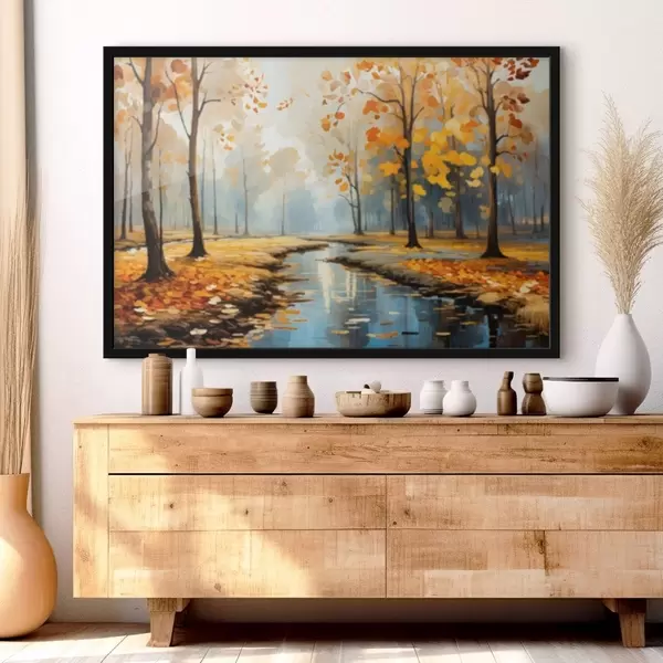 Poster Forêt automnale avec un ruisseau et des feuilles jaunes f47278