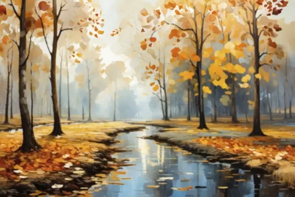 Poster Forêt automnale avec un ruisseau et des feuilles jaunes f47278