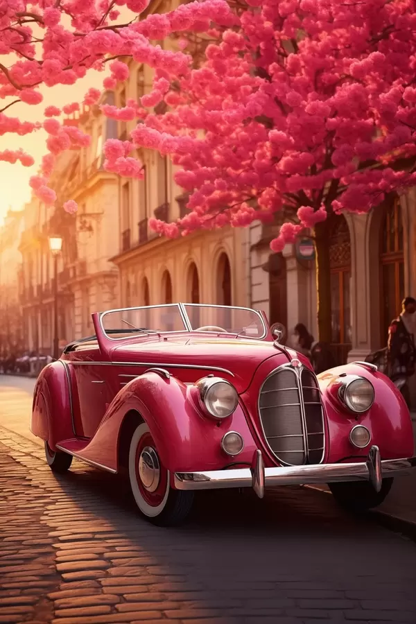 Poster Voiture rose sous les arbres en fleurs Nr f47295