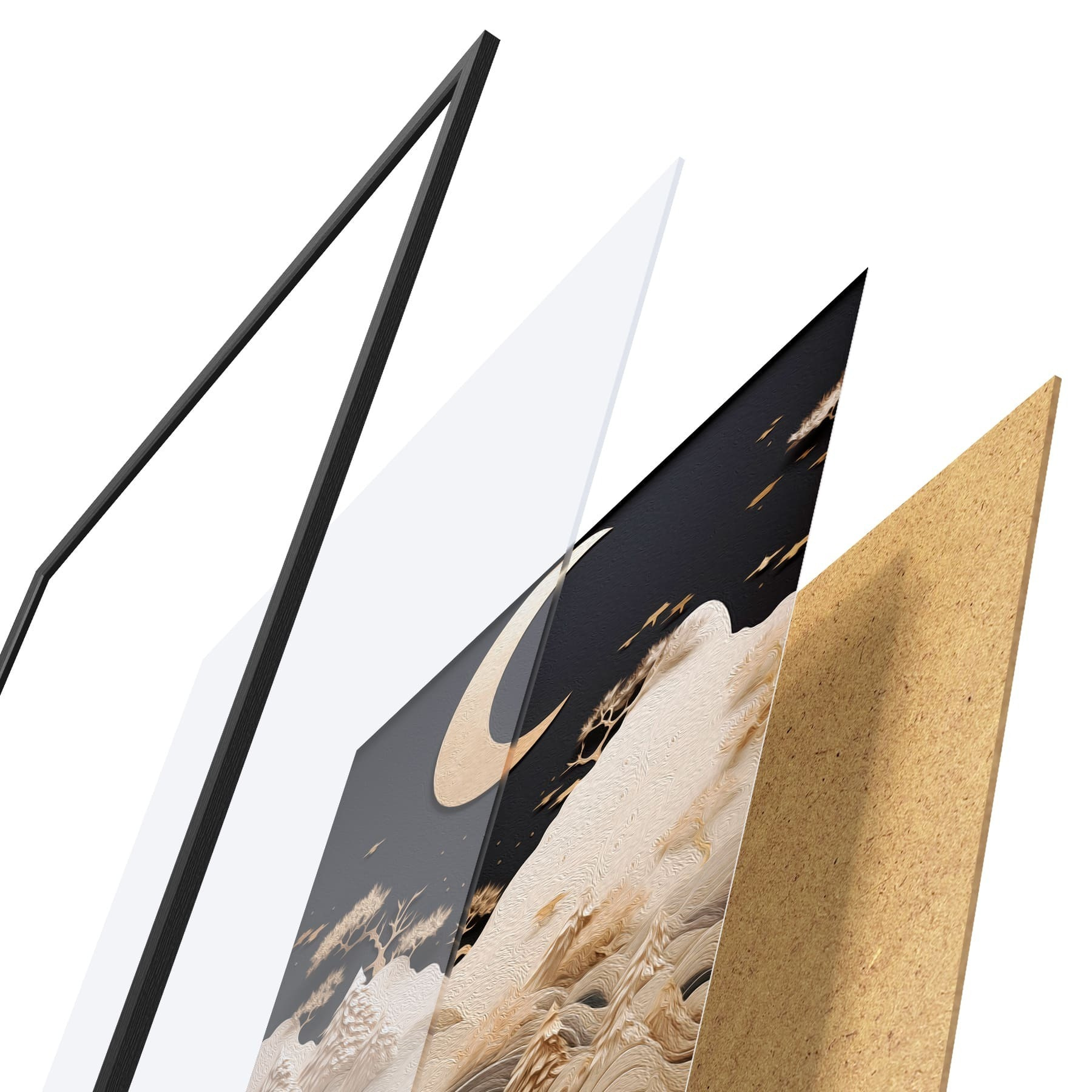 L’affiche encadrée est composée d’un cadre, d’un plexiglas, d’une image imprimée et d’un support en aggloméré. Elle est prête à être accrochée au mur grâce aux fixations situées à l’arrière.