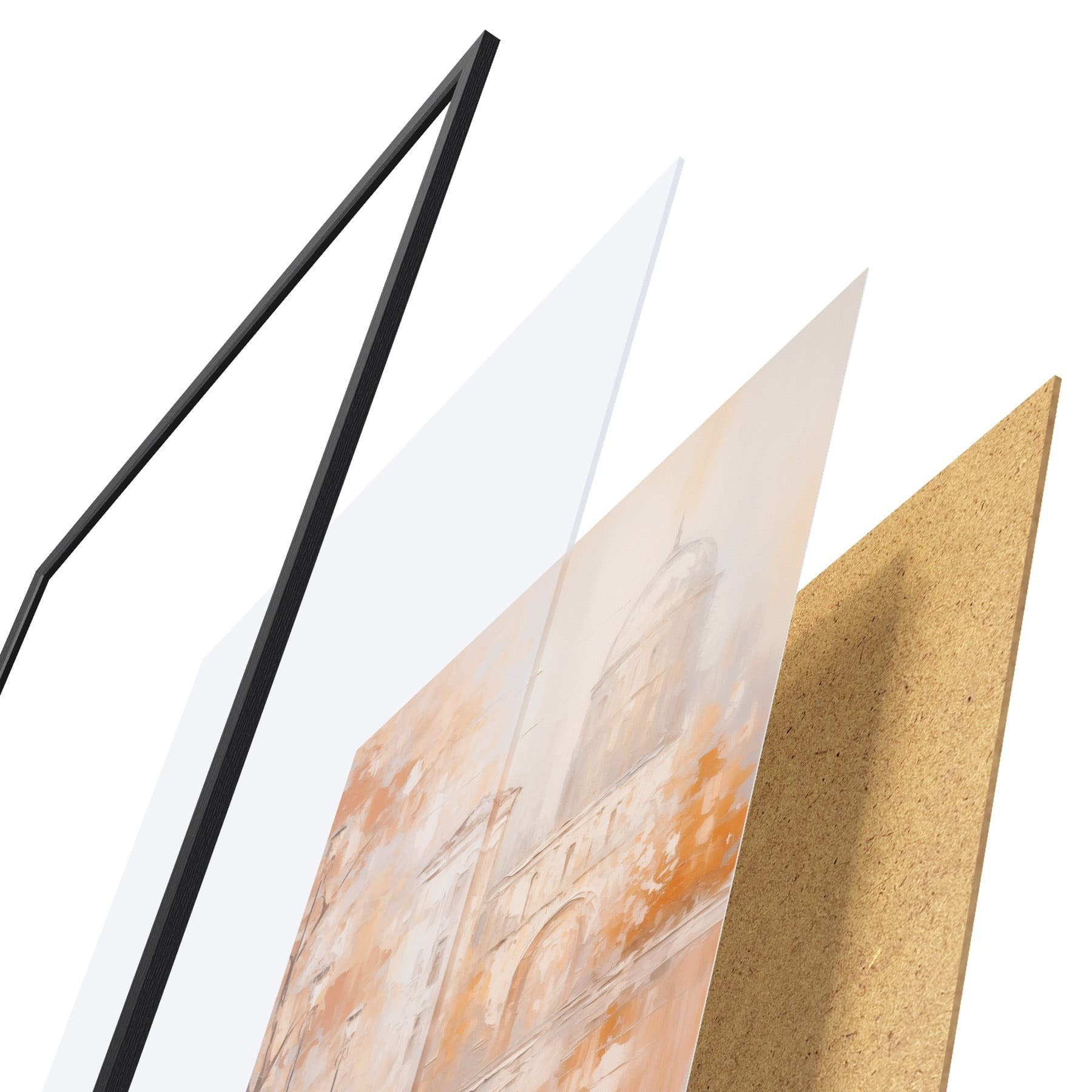 L’affiche encadrée est composée d’un cadre, d’un plexiglas, d’une image imprimée et d’un support en aggloméré. Elle est prête à être accrochée au mur grâce aux fixations situées à l’arrière.