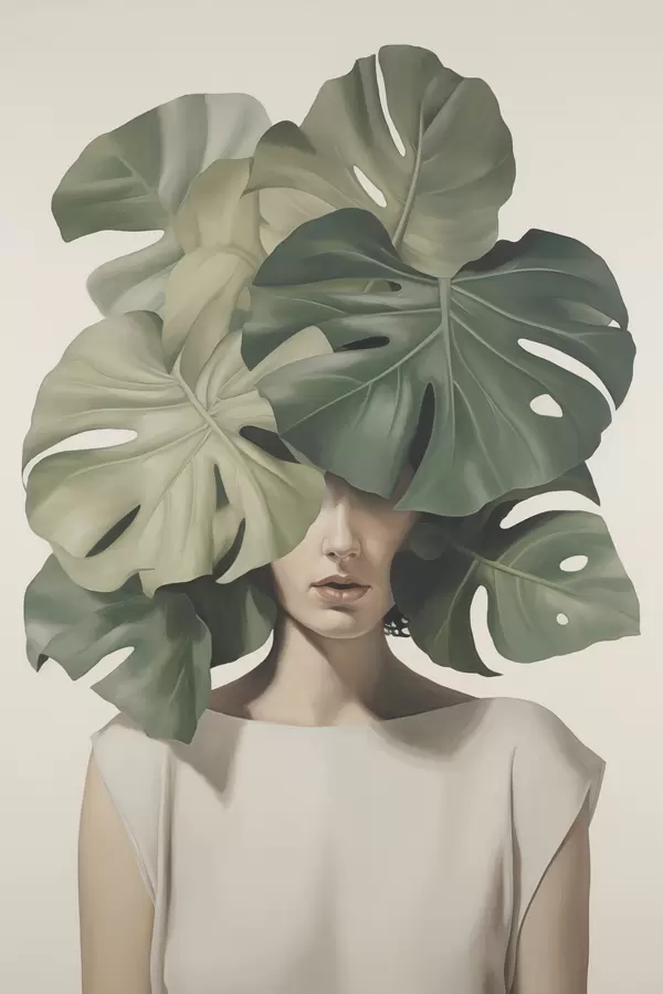 Poster Portrait abstrait d'une fille avec des feuilles de monstera Nr f47336