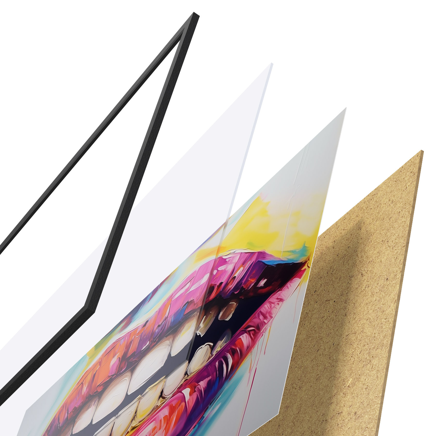 L’affiche encadrée est composée d’un cadre, d’un plexiglas, d’une image imprimée et d’un support en aggloméré. Elle est prête à être accrochée au mur grâce aux fixations situées à l’arrière.