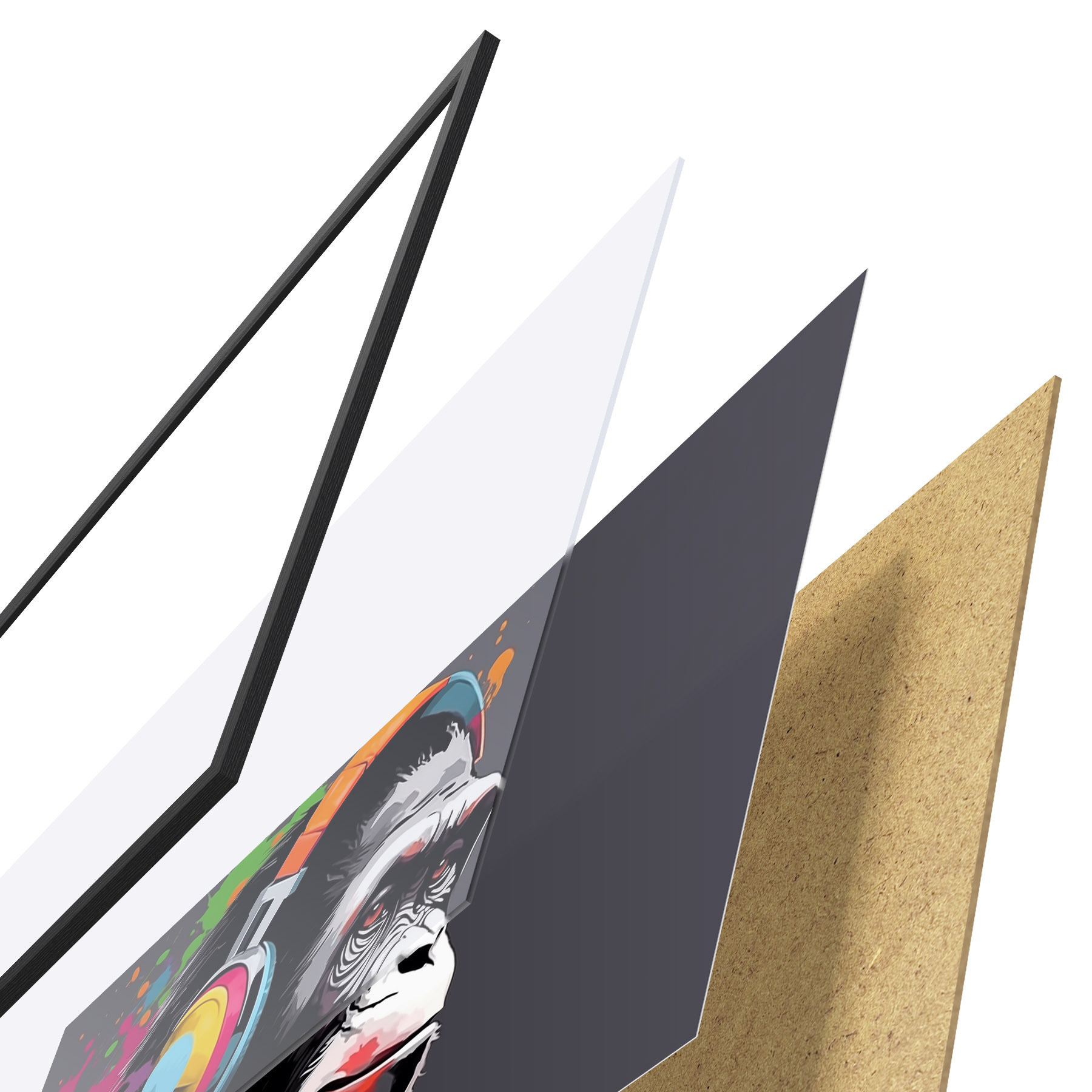 L’affiche encadrée est composée d’un cadre, d’un plexiglas, d’une image imprimée et d’un support en aggloméré. Elle est prête à être accrochée au mur grâce aux fixations situées à l’arrière.